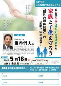 5月18日に開催されました、日本会議岐阜会員大会には多くのご参加ありがとうございました。講師の椎谷哲夫講師からは、選択的夫婦別姓の危険性を鋭い視点から講演いただきました。 共催の「日本女性の会岐阜」の白橋美智子会長。先日 […]